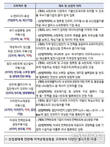 지난 12.19일 발표한 7건의 1차 메가프로젝트는 반도체 및 AI 등 첨단전략산업 및 그 생태계 발전에 파급효과가 큰 사업으로 서로 연계되어 시너지 효과를 낼 것으로 기대되며, 지역성장에 기여하는 등 산업적 의미가 큰 사업으로 구성되어 있다.