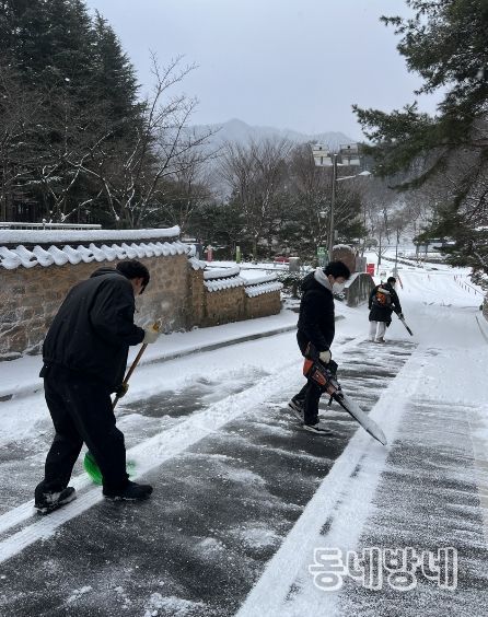 동네방네 김형규 기자 | 김천시시설관리공단이 운영하는 사명대사공원에서는 금일 새벽부터 내린 폭설로 공원 내 보행로와 주요 동선에 적설이 발생함에 따라, 공단 직원들이 송풍기와 빗자루 등 장비를 들고 제설작업에 나섰다.