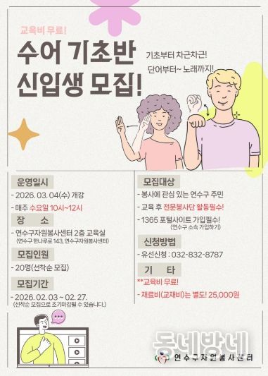 동네방네 김형규 기자 | 연수구자원봉사센터는 오는 3월 4일부터 지역 내 봉사 문화 확산과 봉사단의 전문적 지식 함양을 높이기 위해 ‘수어 기초반’ 교육을 운영하고, 이에 참여할 신입생을 모집한다.