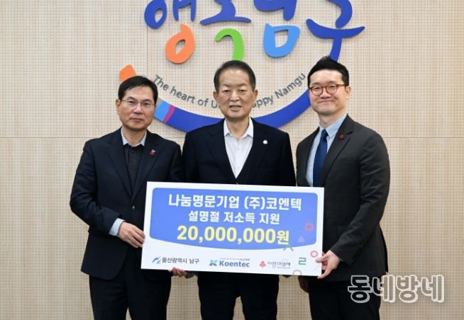 동네방네 김형규 기자 | 울산 남구의 대표적 향토기업인 ㈜코엔텍(대표 김재일)은 2일 남구청을 방문해 관내 저소득층 지원을 위한 성금 2,000만 원을 전달했다.