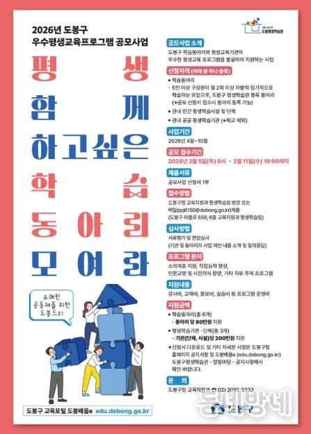 동네방네 김형규 기자 | 서울 도봉구가 2월 5일 오전 9시부터 11일 오후 6시까지 우수 평생교육 프로그램을 공모한다.