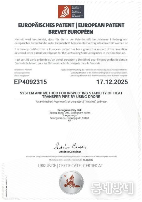 동네방네 김형규 기자 | 성남시가 자체 개발한 ‘드론을 이용한 열수송관 안정성 검사 시스템’이 유럽특허(등록번호 EP4092315) 등록을 완료했다고 밝혔다. 이는 시 최초의 해외특허 등록 사례로, 지식재산의 해외 권리화를 통해 유럽 수출길을 여는 계기가 될 것으로 기대된다.