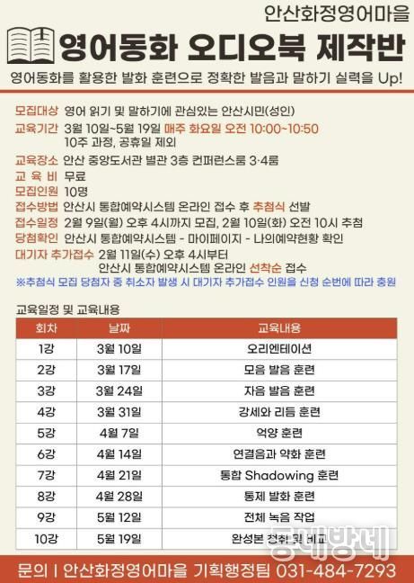동네방네 김형규 기자 | 안산시가 설립하고 안산대학교가 운영하는 안산화정영어마을이 성인 영어 학습자를 위한 ‘영어동화 오디오북 제작반’을 3월부터 5월까지 10주 과정으로 안산시 중앙도서관에서 운영한다고 4일 밝혔다.