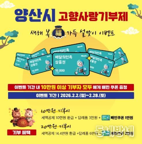 동네방네 김형규 기자 | 양산시는 설 명절을 맞아 고향사랑기부제 참여를 활성화하기 위해 '새해 복(福) 가득 설맞이 이벤트'를 2월 2일부터 2월 28일까지 실시한다고 밝혔다.