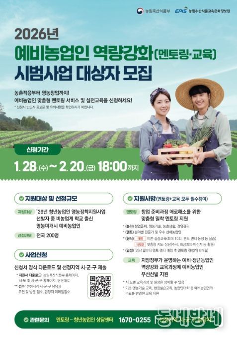 모집 대상은 2026년 청년농업인 영농정착지원사업 선정자 중 농업계 고등학교를 졸업하지 않았거나, 아직 영농을 시작하지 않은 예비농업인이며, 전국 200명 중 경남에서는 22명을 선발한다.
