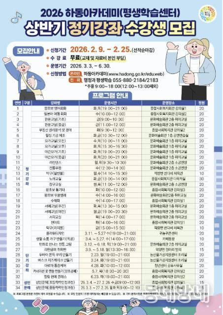동네방네 김형규 기자 | 하동군이 오는 2월 9일부터 25일까지 ‘2026년 상반기 하동아카데미(평생학습센터) 프로그램’ 수강생을 모집한다고 밝혔다.