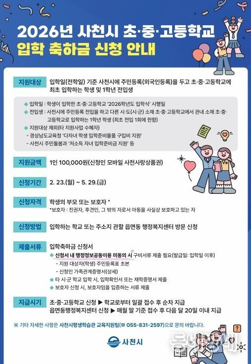 동네방네 김형규 기자 | 사천시는 교육복지 강화를 위해 2026년부터 초·중·고등학교 입학 축하금 지원 대상을 확대해 시행한다고 4일 밝혔다.