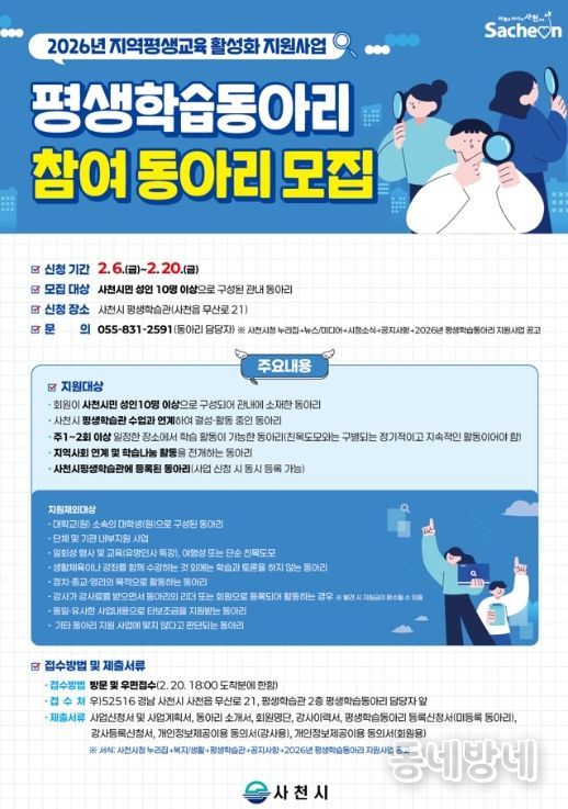 동네방네 김형규 기자 | 사천시는 평생학습도시로서 지역 특성을 반영한 평생학습 추진체계를 정비하고 중장기적 관점에서 지속 가능한 평생학습 기반 구축을 위해 '2026년 평생학습동아리 활성화 지원사업'을 추진한다.