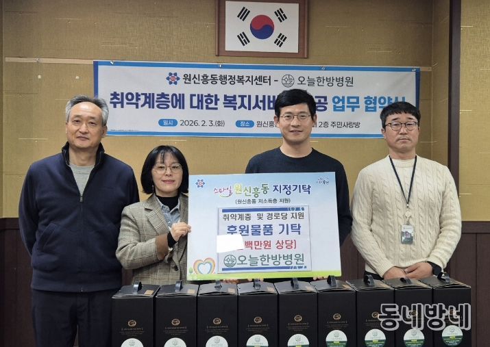 협약식 이후에는 오늘한방병원이 100만 원 상당의 건강 음료를 후원했으며, 후원된 물품은 관내 임대아파트가 위치한 경로당 3곳에 우선 전달될 예정이다.