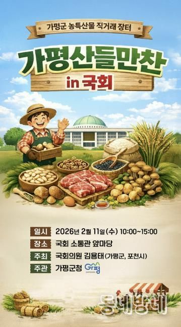 동네방네 김형규 기자 | 설 명절을 앞두고 가평군의 우수 농특산물을 한자리에서 만날 수 있는 직거래 장터가 국회에서 열린다. 소비자와 생산자를 직접 연결하는 이번 행사는 도시민들에게 가평 농산물의 우수성과 가평의 관광자원까지 함께 알리는 자리가 될 전망이다.
