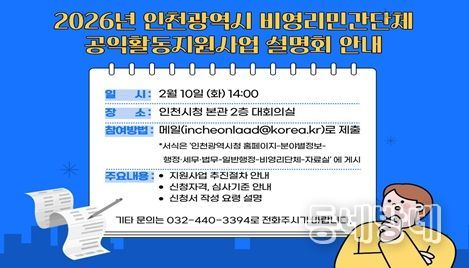 동네방네 김형규 기자 | 인천광역시는 비영리민간단체의 공익활동을 활성화하고 원활한 사업 참여를 지원하기 위해 '2026년 인천광역시 비영리민간단체 공익활동 지원사업 설명회'를 오는 2월 10일 개최한다고 밝혔다.
