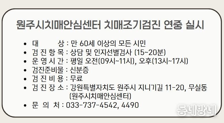 동네방네 김형규 기자 | 원주시치매안심센터는 치매 조기 발견과 적기 치료를 위해 지역 내 60세 이상 주민을 대상으로 치매 조기 검진 사업을 연중 실시하고 있다.