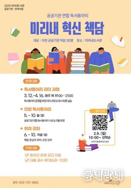 참여 신청은 2월 9일 오전 10시부터 운영 안내문의 큐알(QR)코드를 통해 선착순으로 접수한다. 자세한 사항은 미리내도서관 장서관리팀으로 문의하면 된다.