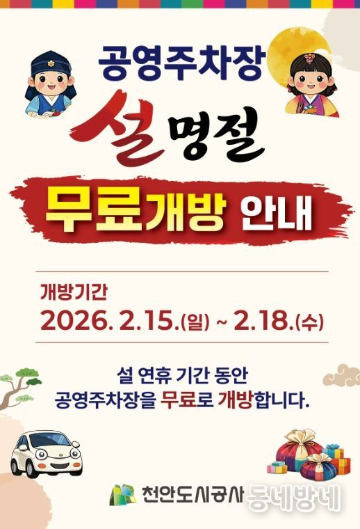 동네방네 김형규 기자 | 천안도시공사는 설 연휴기간 공영주차장을 무료로 개방한다고 5일 밝혔다.