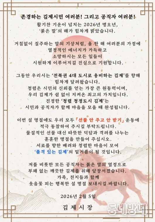 동네방네 김형규 기자 | 김제시는 설 명절을 맞아 청렴한 공직 문화를 조성하고 ‘지평선 너머 새만금까지 비상하는 김제’로 나아가기 위해 올해 제1호 ‘청렴주의보’를 발령한다고 밝혔다.