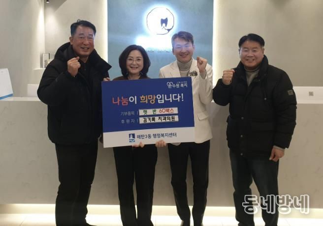동네방네 김형규 기자 | 수원시 영통구 매탄3동 행정복지센터는 지난 4일 김기록치과가 다가오는 설 명절을 맞아 관내 어려운 이웃들을 위해 햇반 60박스를 매탄3동에 기탁했다고 밝혔다.
