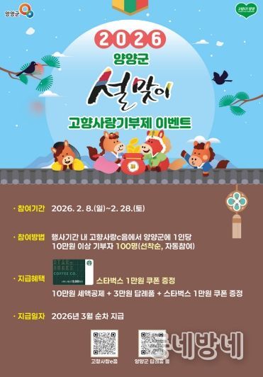 동네방네 김형규 기자 | 양양군이 2026년 설 명절을 맞아 고향사랑기부제 참여 확산을 위해 '붉은 말의 해! 고향사랑기부제 설맞이 이벤트'를 실시한다.