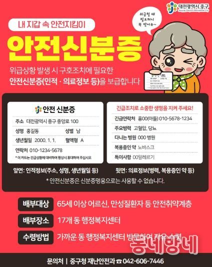 동네방네 김형규 기자 | 대전 중구는 위급상황 발생 시 신속한 구호조치를 돕기 위해 의료정보 등을 기재할 수 있는‘안전신분증’을 제작하여 각 동 행정복지센터를 통해 배부한다고 5일 밝혔다.