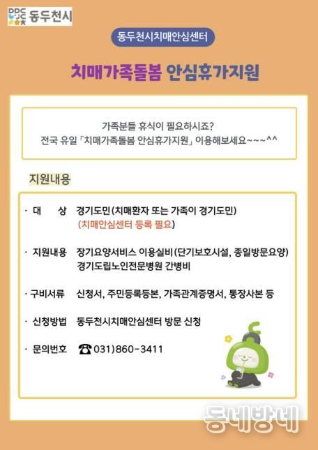동네방네 김형규 기자 | 동두천시치매안심센터는 경기도에서 전국 유일로 시행 중인 '치매가족돌봄 안심휴가 지원사업'을 적극 홍보하고, 치매 환자 가족의 돌봄 부담 완화와 휴식 보장을 위해 사업 안내에 나섰다.