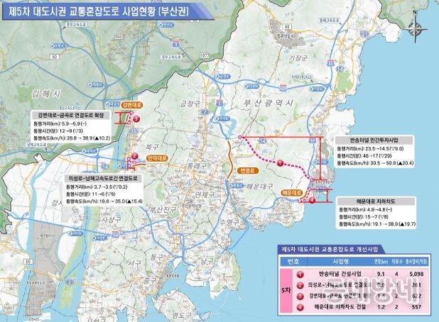 이번 개선사업계획에 포함된 6대 광역시별 주요 사업은 부산광역시 해운대 센텀2지구 ~ 오시리아 관광단지 간 직결로 부산시 외곽 순환도로망을 완성하는 터널을 신설하여 통행시간을 대폭 단축하고, 고속도로 입구와 접속도로 병목구간의 교통혼잡을 해소한다.