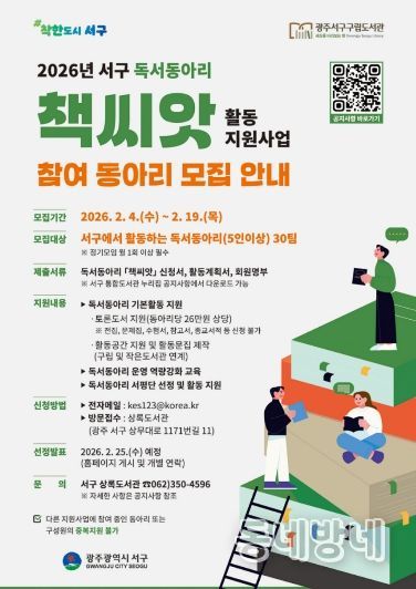 동네방네 김형규 기자 | 광주광역시 서구가 주민 주도의 독서 문화를 활성화하고 책을 통한 소통과 나눔을 확산하기 위해 독서동아리 ‘책씨앗’ 활동 지원사업을 추진한다.