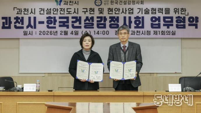 동네방네 김형규 기자 | 과천시는 지난 4일 시청 제1회의실에서 신계용 과천시장과 (사)한국건설감정사회 김창근 회장이 참석한 가운데 ‘건설 안전 도시 구현을 위한 기술협력 업무협약’을 체결했다.