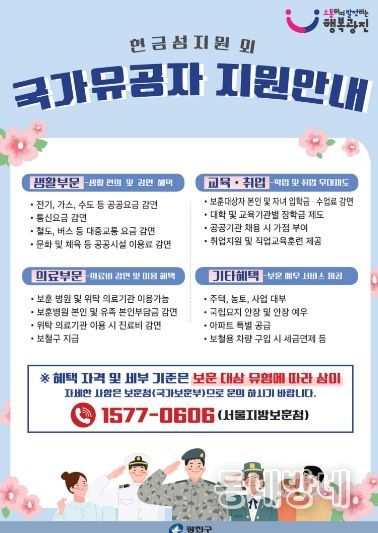동네방네 김형규 기자 | 광진구가 국가유공자와 보훈대상자가 다양한 보훈 지원 정책과 혜택을 쉽게 확인할 수 있도록 안내를 강화한다.