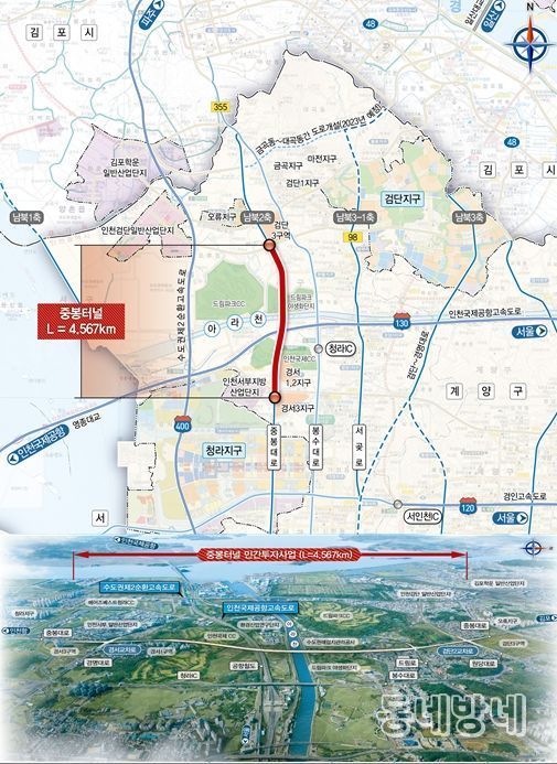 중봉터널 건설사업은 남북 2축 중 단절된 중봉대로(서구 경서동과 왕길동 구간)를 연결하는 총연장 4.57km, 왕복 4차로 규모의 민간투자사업으로 국비 512억 원이 투입되며 봉수대로와 서곶로 일대의 교통혼잡을 완화할 것으로 기대된다.