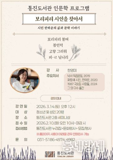 이번 강의는 2월 10일 오전 10시부터 통진도서관 누리집에서 신청할 수 있으며, 한하운 시인에 대해 관심 있는 청소년 및 성인 20명을 선착순으로 모집한다.