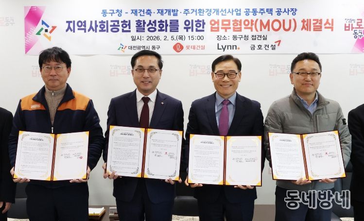 동네방네 김형규 기자 | 대전 동구는 5일 관내 대규모 공동주택 공사 현장의 시공사와 ‘지역사회 공헌 활성화 업무협약’을 체결하고, 지역 안전관리 강화와 상생 협력을 위한 협력 체계를 구축했다고 밝혔다.
