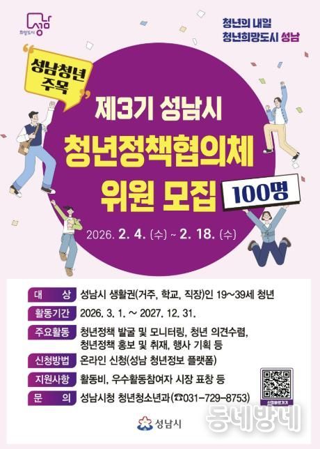 동네방네 김형규 기자 | 성남시는 오는 2월 18일까지 ‘제3기 청년정책협의체’ 위원 100명을 공개 모집한다.