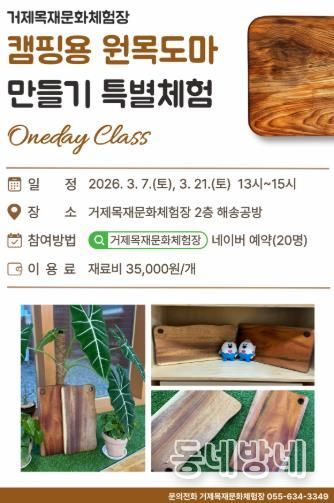 동네방네 김형규 기자 | 거제목재문화체험장은 오는 3월 7일과 3월 21일, 성인 방문객을 대상으로 한 원데이클래스 프로그램 『캠핑용 원목도마 만들기 특별체험』을 운영한다고 밝혔다.