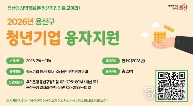신청기간은 이달부터 11월까지로, 우리은행 용산구청지점(녹사평대로 150, 1층) 일자리기금 원스톱서비스 창구에서 신청 가능하다. 융자 신청서와 관련 서류, 기타 자세한 사항은 용산구 누리집 내 ‘용산소개'구정소식'고시/공고 또는 일자리기금’ 게시글 ‘2026년 청년기업 융자지원’에서 확인하고 내려받을 수 있다.