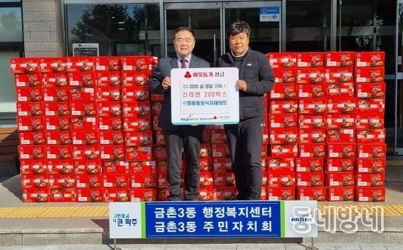 동네방네 김형규 기자 | 파주시 금촌3동은 ㈜화림중앙식자재마트 파주금촌역점으로부터 병오년 설 명절을 맞아 지난 3일, 라면(20개입) 200상자를 관내 취약계층과 노인 가구를 위해 기탁하며 따뜻한 나눔을 실천했다.