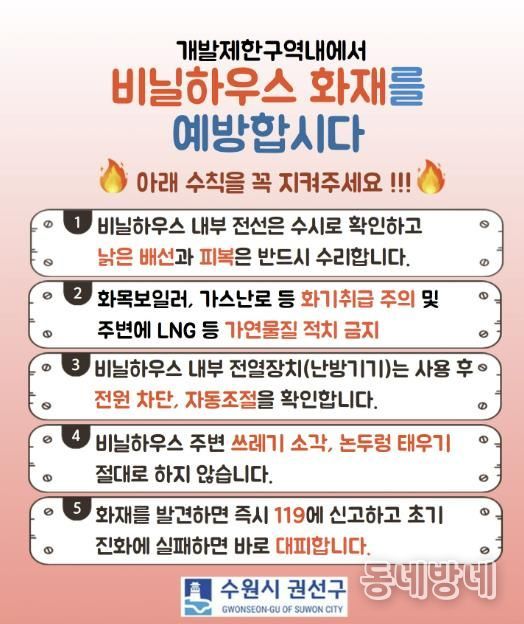 권선구 관계자는 “비닐하우스 화재는 작은 부주의로도 큰 피해로 이어질 수 있는 만큼, 기본적인 안전수칙 실천이 무엇보다 중요하다”며 “앞으로도 개발제한구역 내 화재 취약 시설을 대상으로 지속적인 점검과 홍보 활동을 이어가겠다”라고 밝혔다.