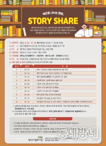 동네방네 김형규 기자 | 양산시립영어도서관은 영어독서에 관심 있는 성인을 대상으로 영어동화지도 역량을 키우고 지역사회 봉사로 연결하는 영어동화지도사 양성·봉사 연계 프로그램 ‘Story Share’참여자를 모집한다고 밝혔다.