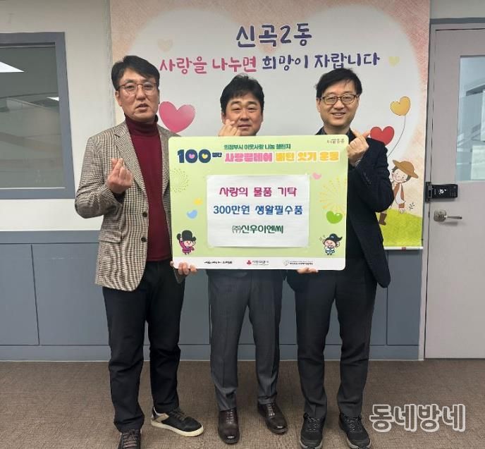 동네방네 김형규 기자 | 의정부시 신곡2동주민센터는 2월 3일 ㈜신우이엔씨가 총 300만 원 상당의 생활필수품(세탁세제‧샴푸‧비누 등)을 기탁하며 ‘100일간 사랑릴레이 배턴 잇기’에 동참했다고 밝혔다.