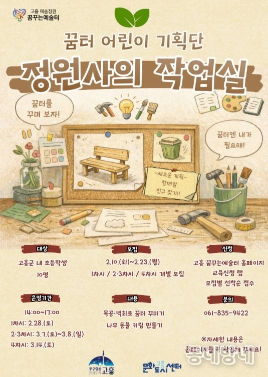 동네방네 김형규 기자 | 고흥군은 오는 2월 10일부터 23일까지 꿈터 어린이 기획단 '정원사의 작업실'에 참여할 지역 내 초등학생 10명을 선착순으로 모집한다고 밝혔다.
