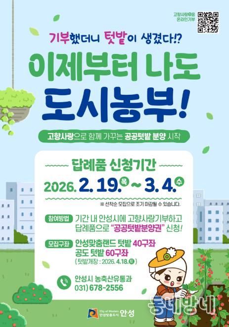 동네방네 김형규 기자 | 안성시는 오는 2월 19일부터 고향사랑기부제를 통해 도시농업을 체험하는 ‘도시농부’를 모집한다고 밝혔다.
