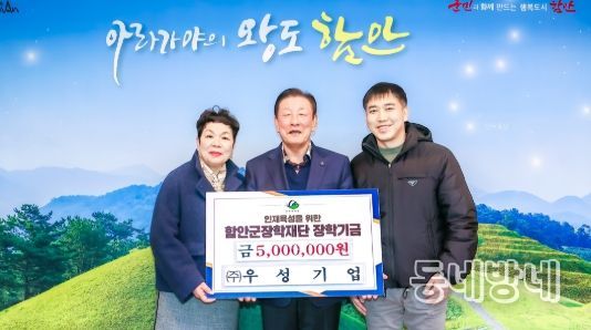 동네방네 김형규 기자 | 함안군은 (주)우성기업(대표이사 박철환)이 지난 9일 함안군 장학재단에 지역인재육성을 위한 장학기금 500만 원을 기탁했다고 밝혔다.