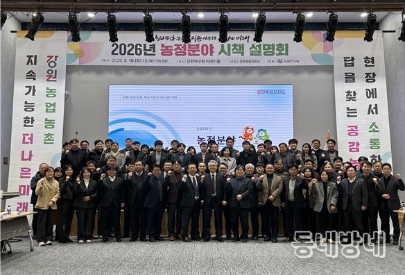 동네방네 김형규 기자 | 강원특별자치도는 2월 10일 강원연구원에서 18개 시군 농정부서장 등 80여 명이 참석한 가운데 ‘2026년 농정분야 시책 설명회’를 개최했다.