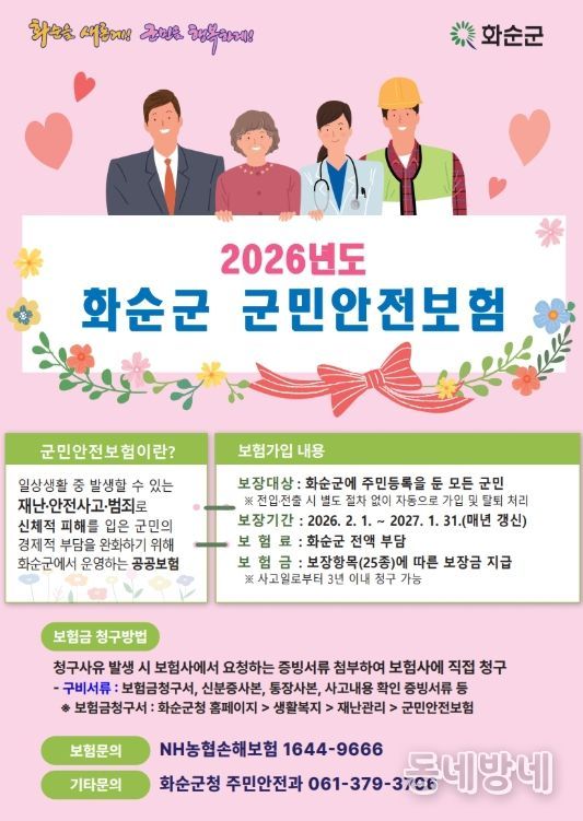 동네방네 김형규 기자 | 화순군은 10일 일상생활 중 발생할 수 있는 각종 재난과 안전사고로부터 군민의 경제적 부담을 덜어주기 위해 ‘2026년도 군민안전보험’을 운영한다고 밝혔다.