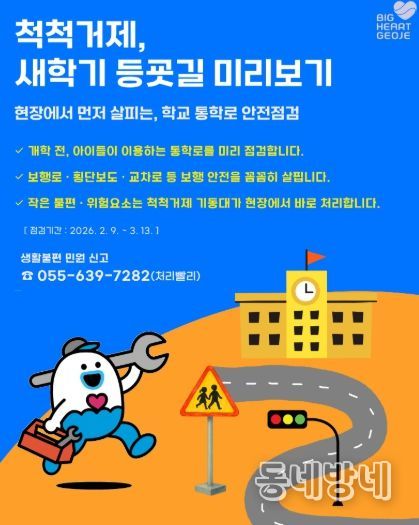 동네방네 김형규 기자 | 거제시는 새학기를 앞두고 학생들의 안전한 통학환경 조성을 위해 '척척거제, 새학기 등굣길 미리보기' 기획순찰을 오는 2월 9일부터 3월 13일까지 추진한다.