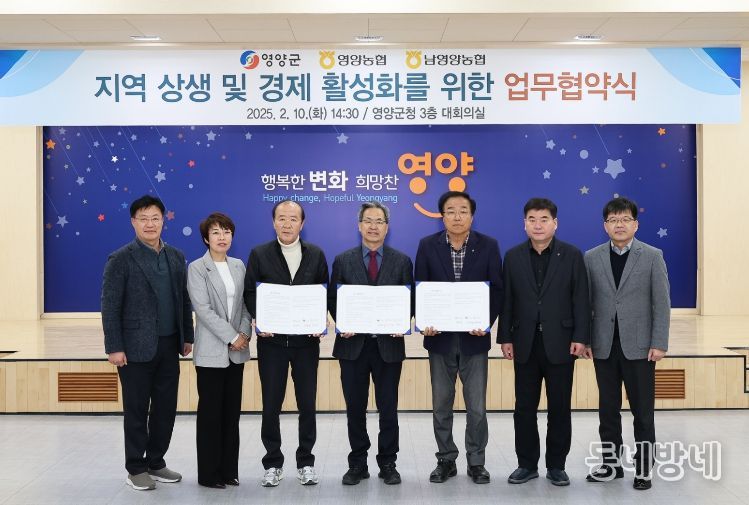 동네방네 김형규 기자 | 영양군은 2026년 2월 10일 군청 대회의실에서 영양농협(조합장 양봉철), 남영양농협(조합장 박명술)과 함께 농촌 기본소득 지역 상생 및 경제 활성화를 위한 업무협약(MOU)을 체결했다.