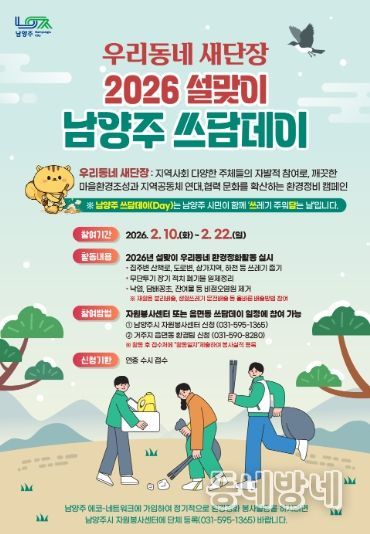동네방네 김형규 기자 | 남양주시는 10일부터 22일까지 시 전역에서 ‘설맞이 우리동네 새단장 남양주 쓰담데이 집중 추진기간’을 운영한다고 밝혔다.