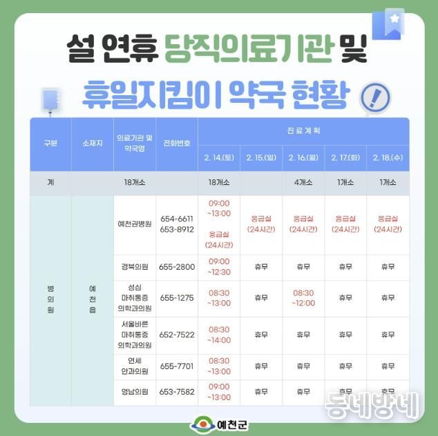 동네방네 김형규 기자 | 예천군은 설 연휴 동안 관내 병․의원 당직의료기관과 휴일 지킴이 약국을 운영해 진료 편의와 응급진료 서비스를 제공한다.