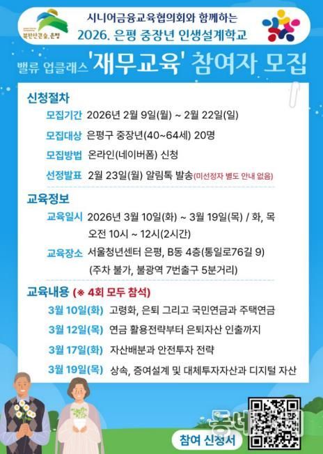 동네방네 김형규 기자 | 서울 은평구는 중장년층의 안정적인 인생 2막 준비를 지원하기 위해 2026년 ‘은평 중장년 인생설계학교’ 재무·직업설계 교육 참여자를 모집한다고 밝혔다.