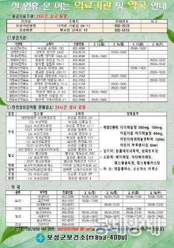 한편, 설 연휴 기간 시설 운영 및 휴관 정보는 보성군청 누리집에서 확인할 수 있으며, 생활 불편 사항은 종합상황실 및 읍면사무소(행정복지센터)로 문의하면 된다.