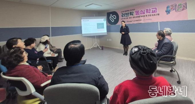 ‘노인동심학교’는 러브락문화예술평생교육원과 협약을 통해 추진되는 사업이며, 동요를 중심으로 율동·건강·체조의 창의적 신체 표현, 음악·미술·놀이 요소를 결합한 통합예술 과정을 운영한다. 이를 통해 어르신들이 향후 사회복지 기관 및 각종 단체에 파견되어 활동할 수 있는 동요예술 통합 지도자로 성장하도록 지원하는 노인일자리 사업단이다.