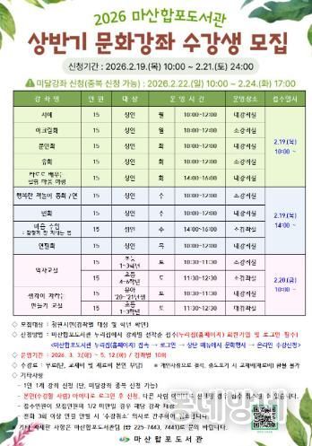 동네방네 김형규 기자 | 창원특례시 마산합포도서관에서는 시민들에게 다양한 평생학습 기회를 제공하고자 ‘2026년 상반기 문화강좌’ 수강생을 2월 19일부터 2월 24일까지 마산합포도서관 누리집에서 온라인(선착순)으로 모집한다.